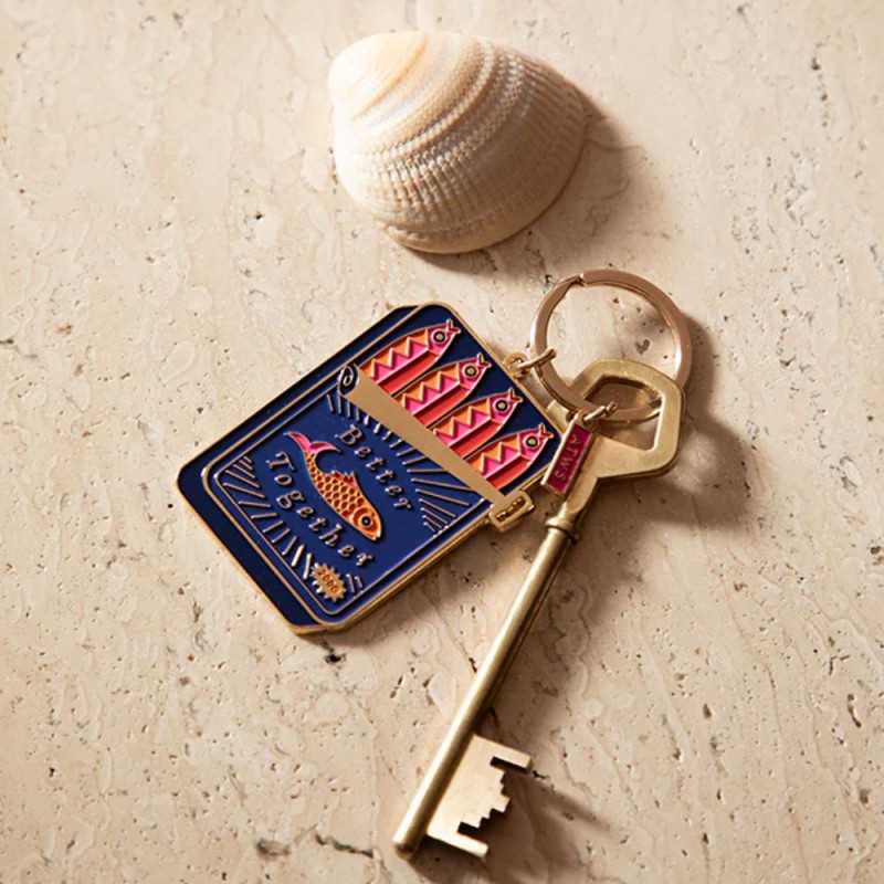 Inspiré des boîtes de sardines portugaises, il symbolise la convivialité, le partage et la joie d’être ensemble. Son design coloré en émail bleu et rose, bordé d’une finition dorée brillante, en fait un accessoire plein de charme et de caractère.