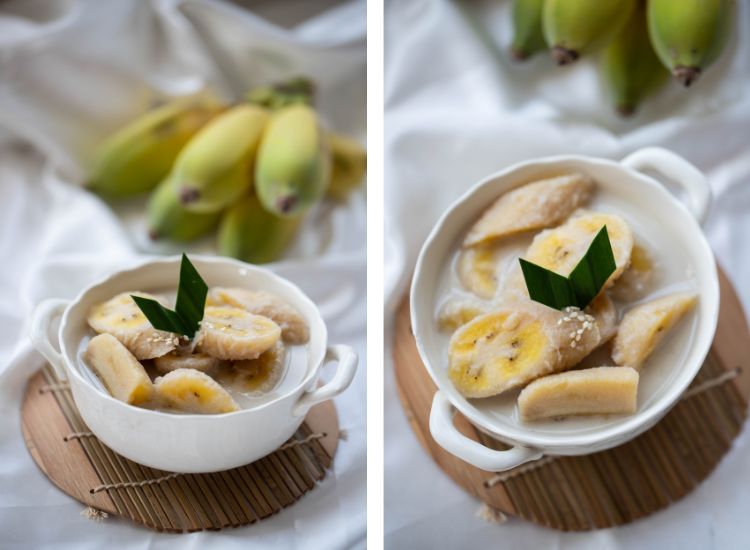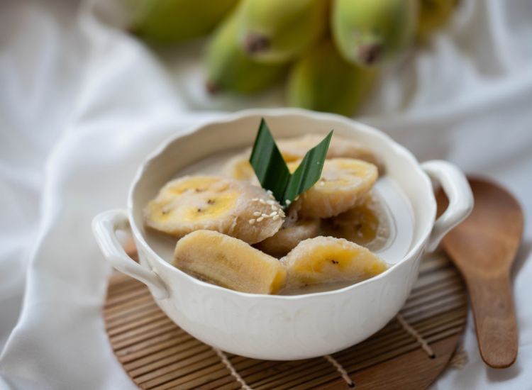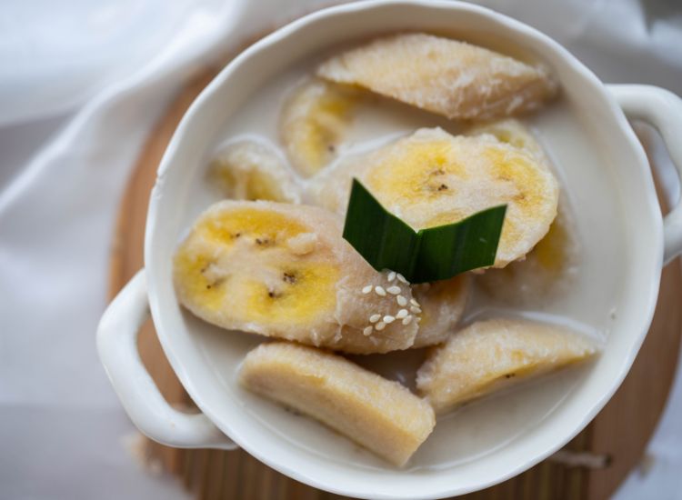 Ajouter les morceaux de banane dans la crème de coco chaude.